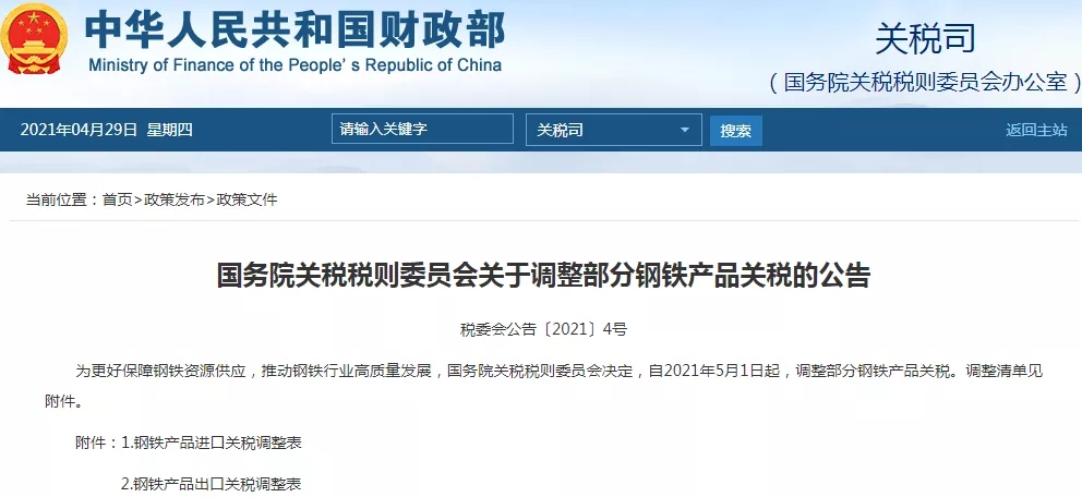 為更好保障鋼鐵資源供應(yīng),推動(dòng)鋼鐵行業(yè)高質(zhì)量發(fā)展,國(guó)務(wù)院關(guān)稅稅則委員會(huì)決定,自2021年5月1日起,調(diào)整部分鋼鐵產(chǎn)品關(guān)稅。調(diào)整清單見(jiàn)附件。